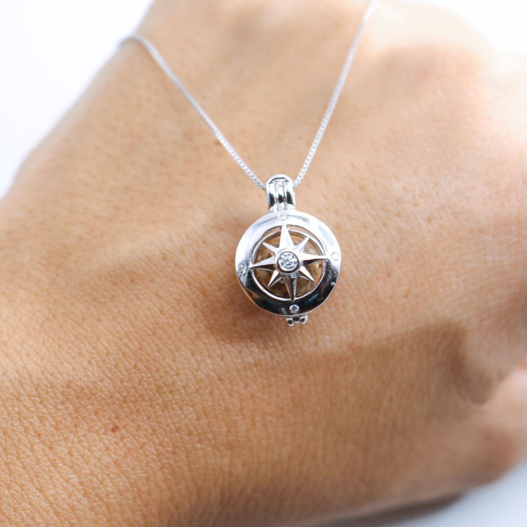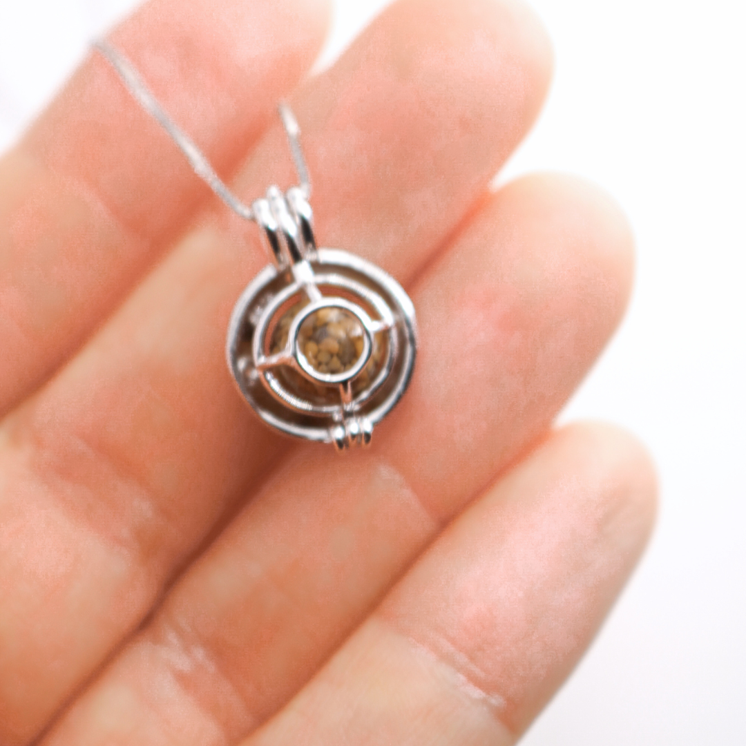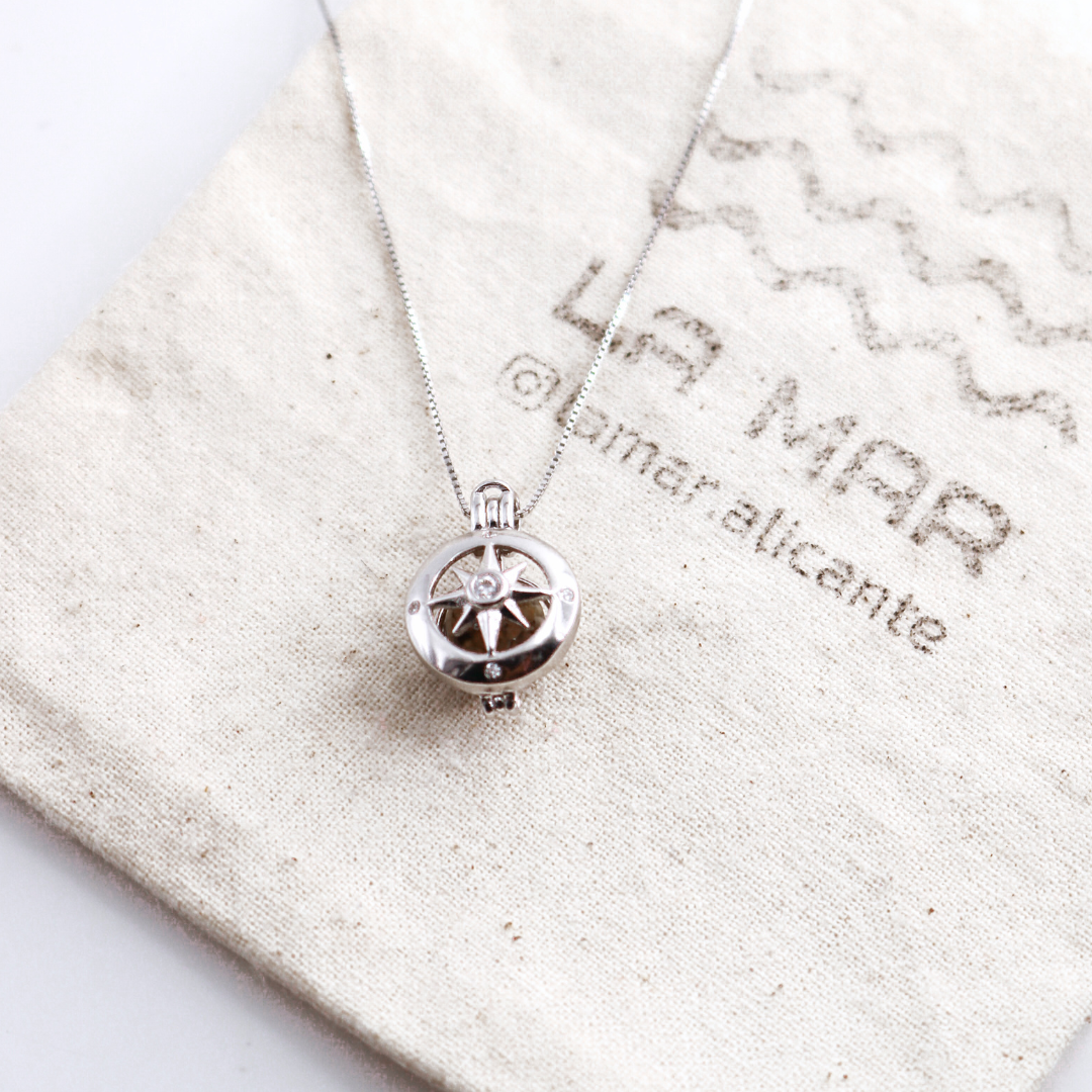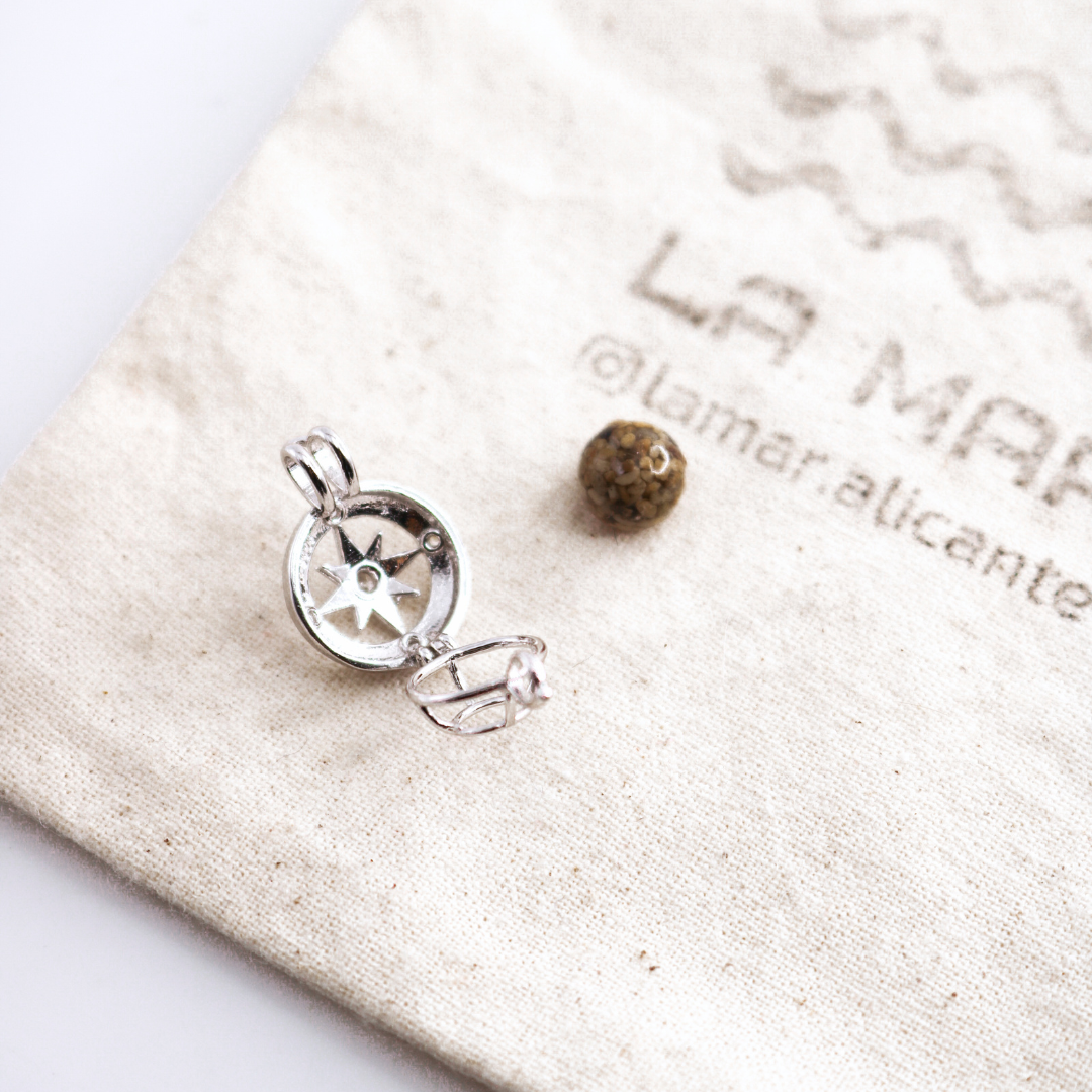 La perla está elaborada a mano con las cenizas o arena de un lugar importante, reflejando la fuerza del mar y la importancia de mantener el rumbo en la vida.